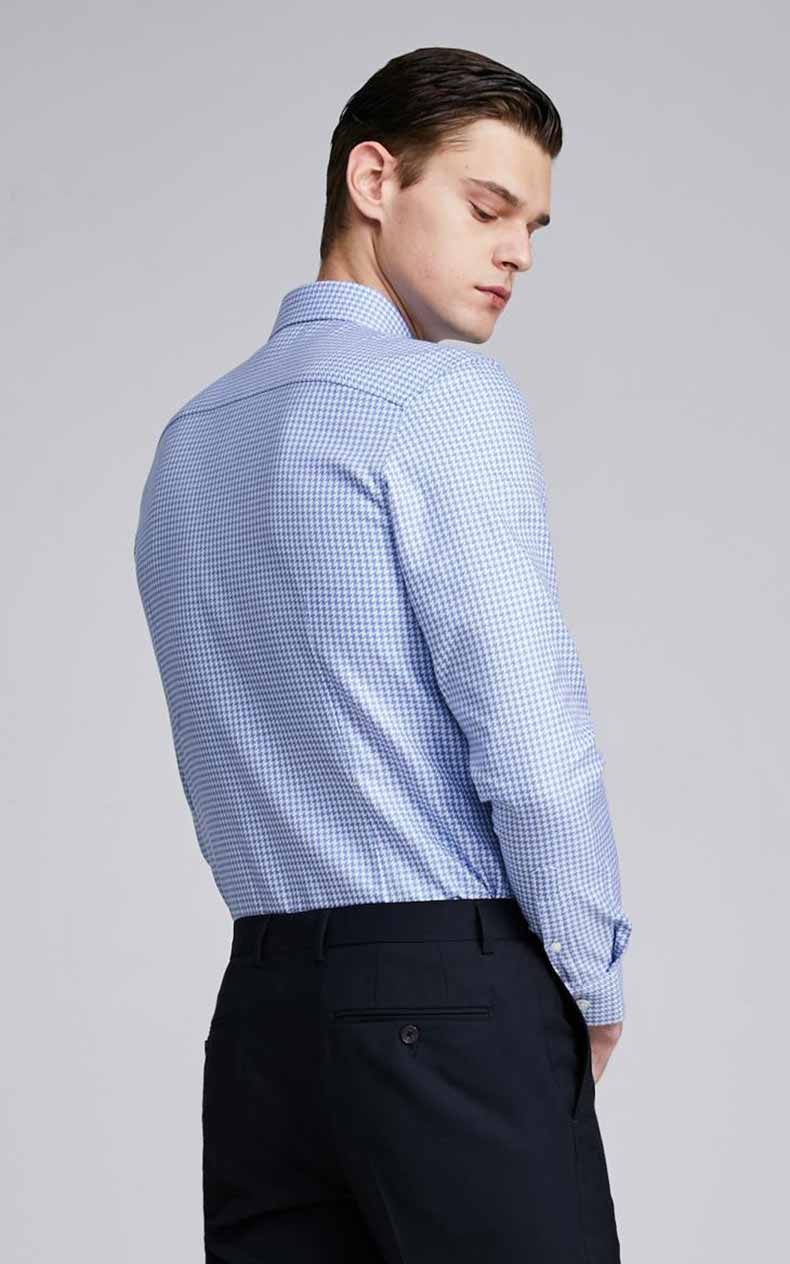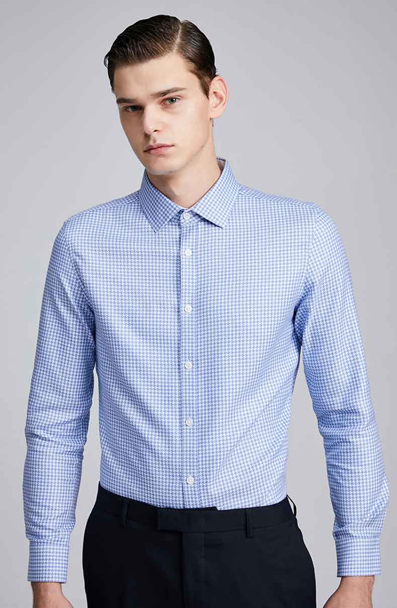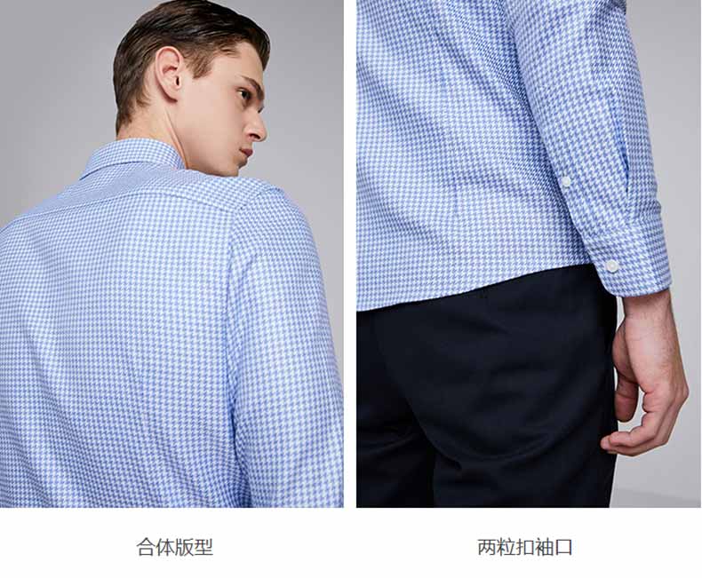 藍(lán)色千鳥格圖案,賦予商務(wù)男士穿搭以雅致清爽的感覺.內(nèi)搭以及外穿都適宜.是一款比較受年輕男士追捧的襯衫款式.