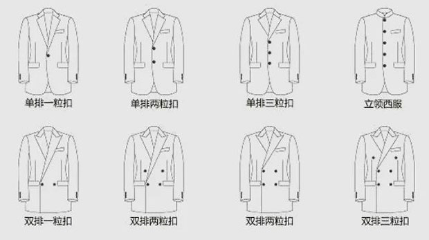 男士西裝的前止口處的疊門主要包含單排扣和雙排扣兩種類型。在前襟扣位水平方向相對(duì)固定的前提下,雙排扣的駁領(lǐng)比單排扣的駁領(lǐng)縱向傾斜的幅度更大。