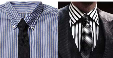 首先,我們要說的襯衫花型是“條紋”,條紋襯衫可大致分為細條紋襯衫和粗條紋襯衫。其中,細條紋襯衫最宜搭配單色的領帶,絲質或針織型領帶均可,而粗條紋襯衫,如孟加拉條紋的襯衫,則可以搭配細小圖案的深色領帶。